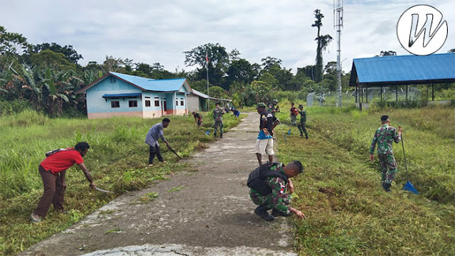 KEEROM - wartaexpress.com - Sebagai upaya menata lingkungan menjadi rapi dan bersih, Satgas Yonif 126/KC, Pos Bompay, mengajak warga melaksanakan karya bakti pembersihan Balai Desa di Kampung Bompay, Distrik Waris, Kabupaten Keerom.